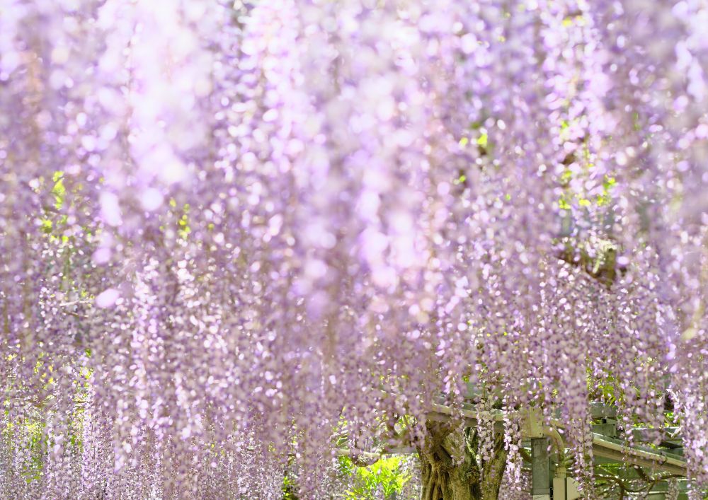 当園のシンボルでもある「大藤棚」が、ついに満開の見頃を迎えました。長さ1メートル以上にもなる紫色の花房が滝のように降り注ぐ姿は、まさに圧巻の一言です。 藤棚の下を歩くと、頭上から降り注ぐような花のシャワーとともに、藤特有の甘く上品な香りが全身を包み込みます。特に、朝の澄んだ空気の中や、夕暮れ時に西日を浴びて輝く藤の姿は、この時期にしか見られない幻想的な美しさです。 今年は天候にも恵まれ、花房のボリュームも例年以上となっております。見頃は今週末から来週前半まで続く予想ですが、春の風や雨により花が散ってしまうこともございますので、ぜひお早めにお越しください。紫色の絶景が広がる藤棚の下で、日常を忘れて心癒されるひとときをお楽しみください。